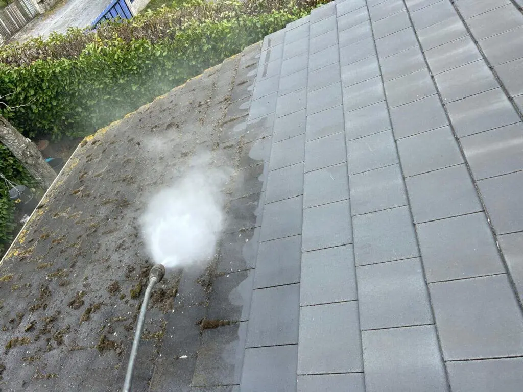 Élimination complète des mousses, lichens et algues qui fragilisent vos tuiles et compromettent l’étanchéité de votre couverture.